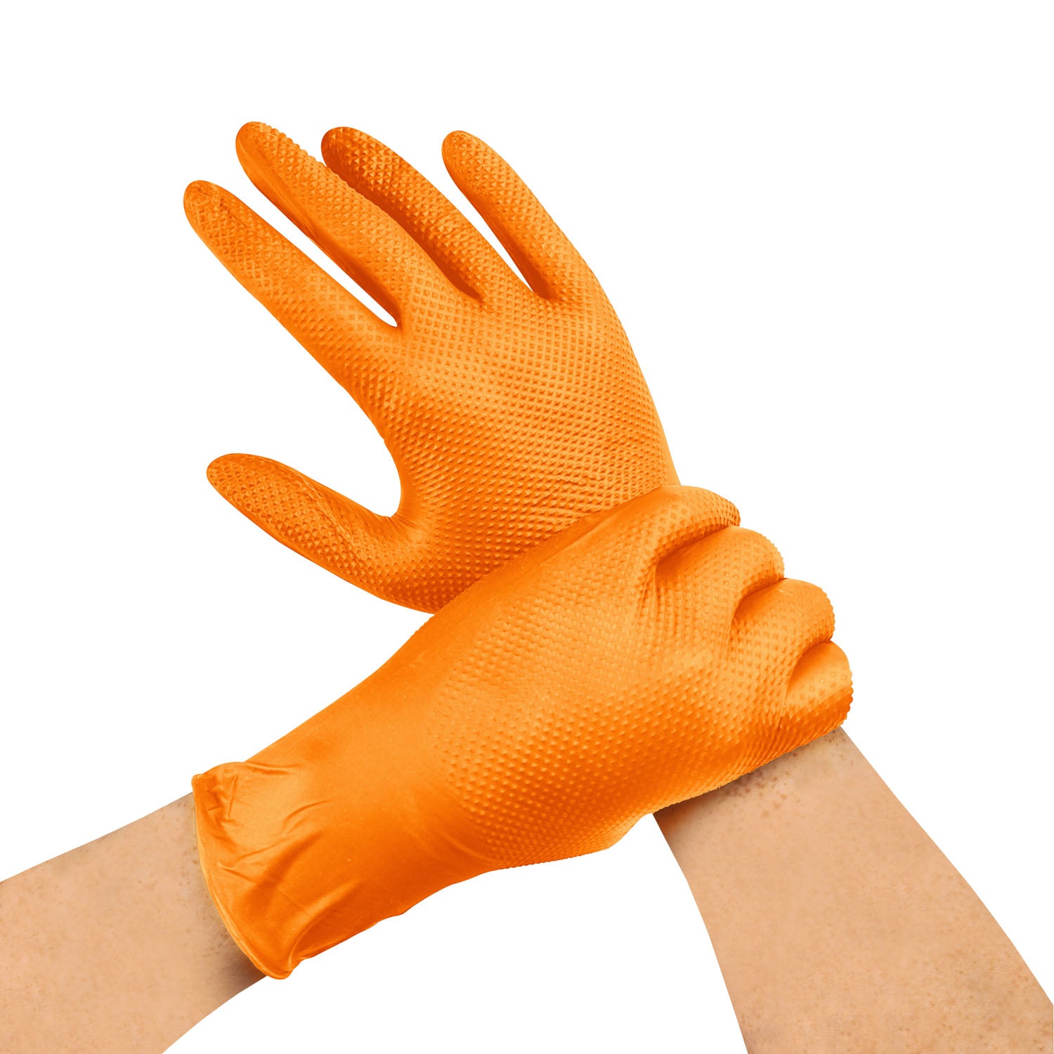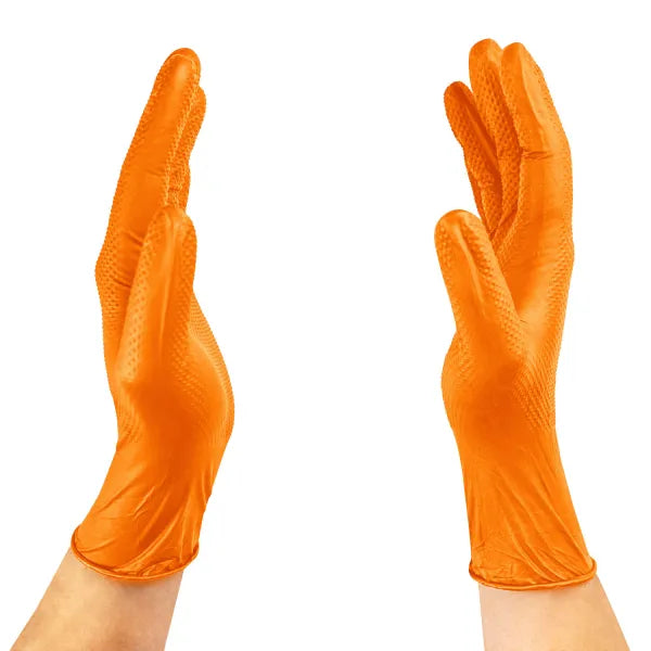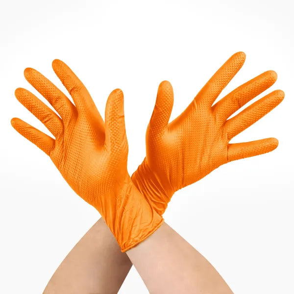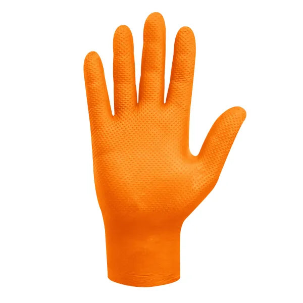 Guante de nitrilo naranjo texturizado diamantado de 8 gramos, diseñado para brindar alta resistencia, durabilidad y excelente agarre. Su color naranjo no solo aporta alta visibilidad, facilitando la detección de las manos en ambientes de riesgo, sino que también permite identificar rápidamente posibles roturas o daños en el guante, reduciendo así el riesgo de contaminación o accidentes. Gracias a su fabricación 100% en nitrilo y su textura antideslizante, ofrece un excelente agarre incluso en superficies húmedas o aceitosas. Ideal para la industria automotriz, faenas industriales, minería, talleres, limpieza pesada y manipulación de alimentos, este guante combina resistencia, seguridad y comodidad en una sola pieza. Además, cuenta con tecnología touch, permitiendo el uso de pantallas y dispositivos móviles sin necesidad de retirarlo. Su empaque individual es una caja de 100 unidades (50 pares).